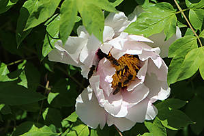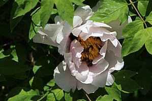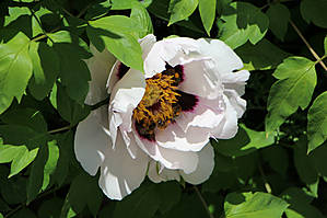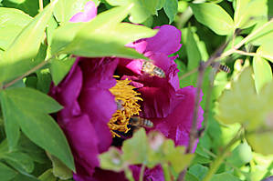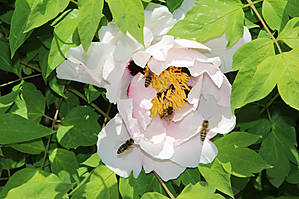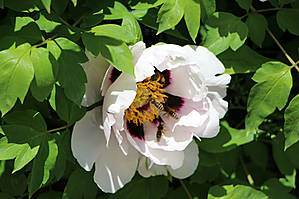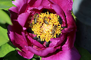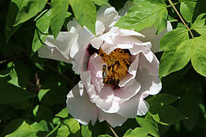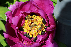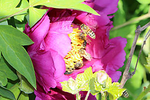 Теперь то я уже взрослая, уже скоро внучке буду это рассказывать. Но до сих пор сама толком не знаю, как из пыльцы получается мед, что носят пчелки на задних лапках и вообще... об этом лучше спросить у Виктора, который Виктор-Виктор:) Но вот расцвел у нас древовидный пион, который пользуется большим успехом у местных пчелок. И у них на задних лапках частенько видны желтенькие брикеты, или мед в таблетках, или что там у них это:)))