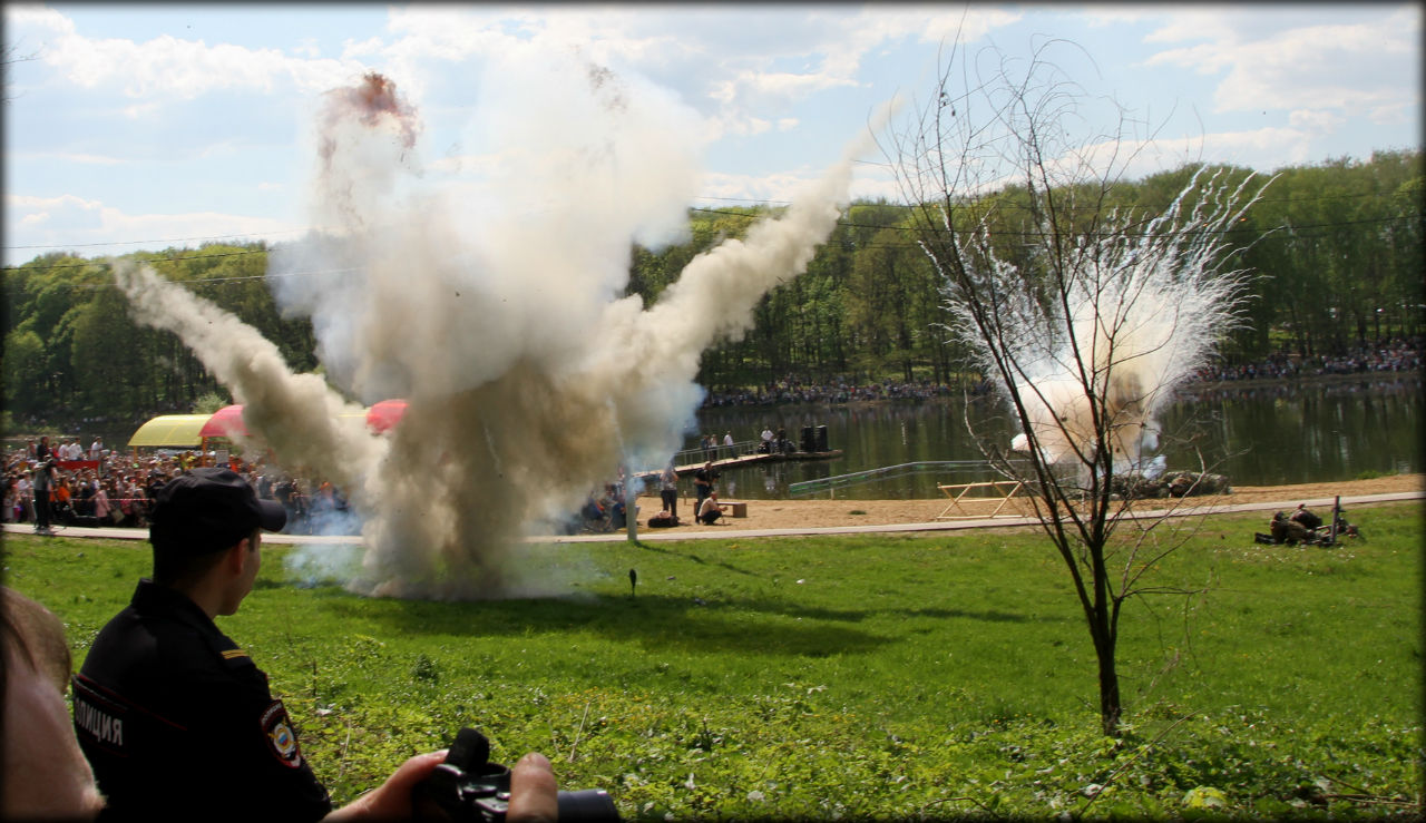 В этом году она называлась "Встреча на Эльбе" и я заранее занял предпочтительное место во втором ряду (в 2015 году я стоял совсем далеко). Так вот, когда началось сражение из-за частых взрывов и выстрелов было 100%-е присутствие на поле боя.