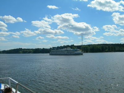 Показала ребятенку два круизных лайнера. Один стоял у причала, другой шел вниз по течению. Туда же шел и речной трамвайчик. Вверх по течению шло два сухогруза.