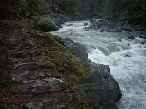 Тропа «Озеро бобров» у городка лесорубов Даррингтон когда-то шла по пути старого заброшенного железнодорожного полотна вдоль вырубки, мимо маленького озера (скорее болота) с бобрами к одной из немногих оставшихся рощ «старых» гигантов. Потоки 2006-го смыли тропу посередине, и теперь она неожиданно кончается поворотом реки.