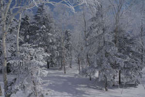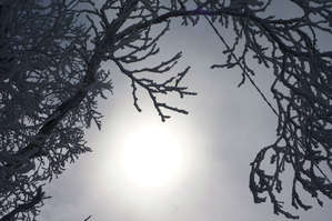 Первым делом поднялась на "Горный воздух". Лес, который я увидела на вершине комплекса, начисто выбил из головы все желания, кроме одного — насладиться увиденным. Это чуть позже налетит тучка, пойдет снег, а сейчас сияло голубое небо и на его фоне выделялось белое кружево заснеженных деревьев изумительной красоты. Зима старалась, она не хотела уходить и говорила нам — я еще не все показала вам! Я еще вас не раз удивлю!