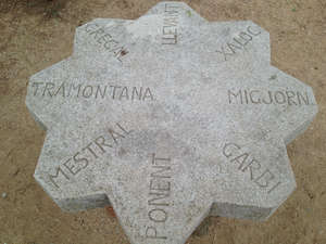 Оливковые опунции Святого Себастьяна), я обратил внимание на каменный стол рядом со смотровой площадкой. Его я не замечал раньше. Это был стол с розой ветров на каталонском:
