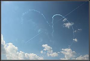 Наступил очень нервный момент, самолеты синхронно замедляли скорость и практически зависали в воздухе, оставляя после себя следы и яркие искры…