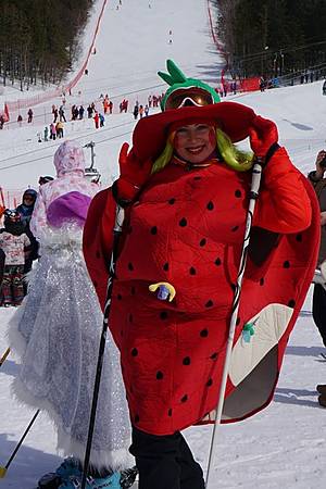 На исходе зимы в г. Южно — Сахалинске на склонах спортивного комплекса " Горный воздух " каждый год проводится костюмированный " Снежный карнавал ". Самое удивительное -наряжаются и взрослые , и дети. Каких только костюмов не было ! Склоны пестрели от нарядов — народ не стоял , а вовсю катался по трассам.