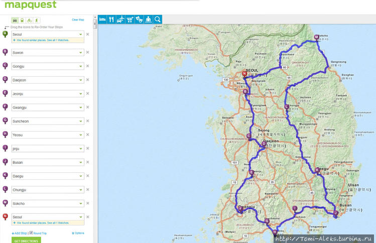 Но с ней именно такая вот проблема. Хотя рисует она красиво. Вот одна из попыток составить маршрут — здесь не полная картина (какие-то города просто отказываются вписываться в маршрут, хотя на карте этой они есть). В Гугл.мапс, кстати, я никак не могу пока составить маршрут — не пойму, как там добавлять новые пункты. Если подскажете, буду благодарен. Самая большая проблема везде одна: крупные города есть, а мелких — нет.Вот мне интересно, когда вы готовитесь к аналогичному самостоятельному путешествию, какие вы при этом используете программы для построения маршрута? Буду рад, если кто-то более продвинутый в этом вопросе, чем я, поделится своим опытом! А у меня на данный момент получается вот такой славный маршрут. Не исключено, что в нем есть какие-то несуразности, которые выяснятся уже в процессе путешествия. Ведь часто верить тому, что напечатано на бумаге, нельзя. Если среди вас есть "корееведы", готов к критике маршрута. Как ни странно, многие, кто побывал в ЮК, ограничивались при этом Сеулом, Пусаном и островом Чеджу-до. А как же другие, не менее интересные города? Ведь страна круглая и идеально подходит для кругового сквозного маршрута...