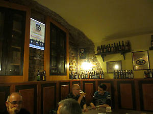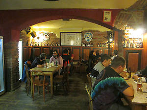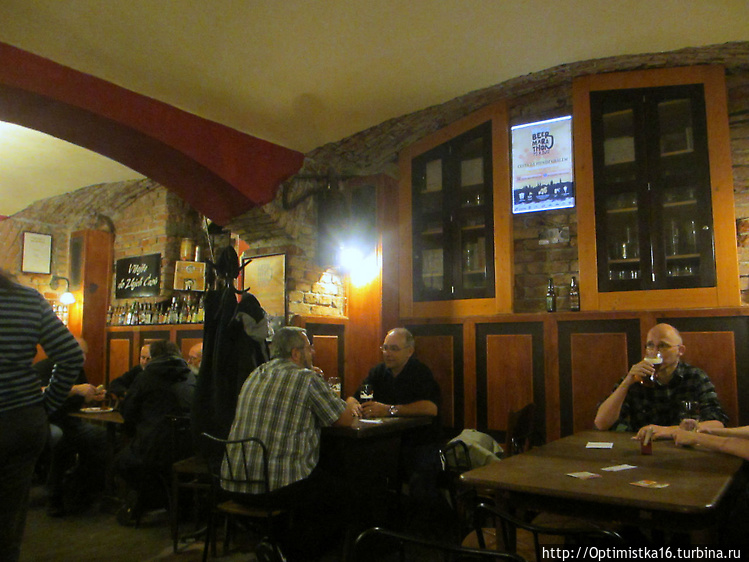 И вот, наконец, мы в баре. Сразу спускаемся в подвал, куда советует сайт — путеводитель по пиву, и обнаруживаем, что свободных мест нет. Вернее, места свободные есть, но все они зарезервированы. Мы и не думали, что в понедельник будет так много желающих провести вечер за кружкой пива. Значит, место, действительно, стоит того!