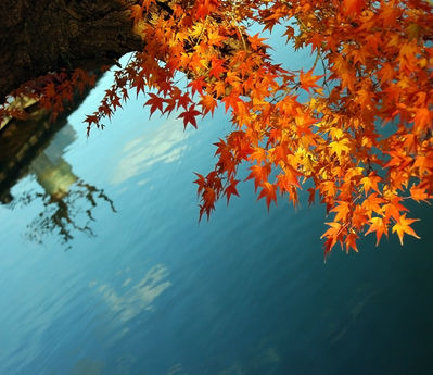 Эта фотография сделана в Киото в храме Дайкакудзи в сезон ярких осенних листьев. Ветка японского клёна склонилась над поверхностью пруда, на берегу которого, на маленьком деревянном пирсе, стоит композиция икэбаны. Икэбана создана человеком, клён выкрасила в оранжевый цвет природа. И то и другое недолговечно, как облака, отражающиеся в пруду — и прекрасно в своей недолговечности.
