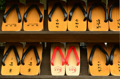 Традиционные японские деревянные сандалии у входа в публичный банный дом в курортном городке Киносаки. Среди суровых чёрных мужских сандалий — одна пара нежных красных женских. Яркое и трогательное сочетание, которое заставит каждого задуматься примерно о том же — и при этом о своём.