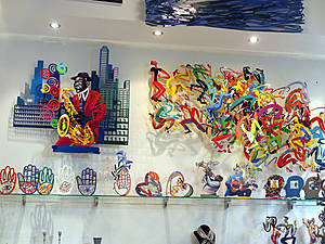 Где много ресторанов, кафе, магазинов, где выступают музыканты и клоуны.