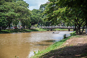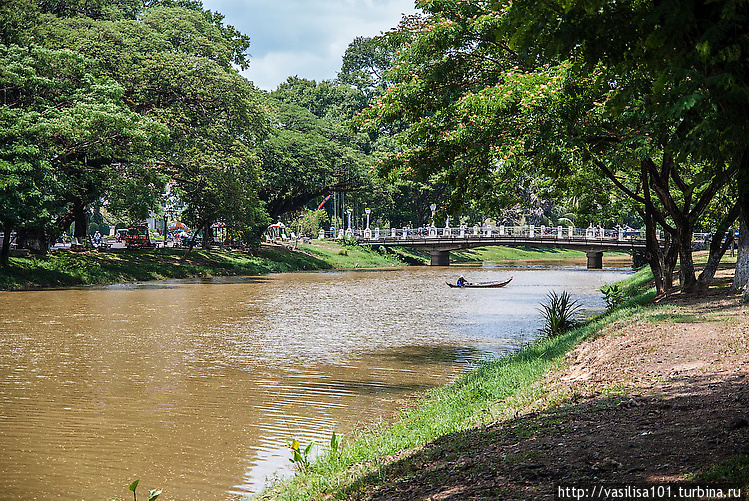 Отнесли покупки обратно в номер, опять идем в центр :) Диме в гесте дали небольшой, но полезный бесплатный буклет с рекламой и картами. Очень удобно. Идем к реке мутно-зеленого цвета. Набережная обсажена деревьями, скамеечки стоят. Очень симпатичное место для прогулок. По реке плавает лодочка, человек в ней что-то сетями достает. Неужели рыбу? Или, скорее мусор?