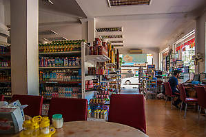 Тут же, в супермаркете, есть небольшое кафе с европейской и местной едой и эспрессо. О, кофе!!! Сразу за столиками лестница ведет на второй этаж, где расположены номера гестхауса. Удобно — и супермаркет и гест и кафе и книжный :)