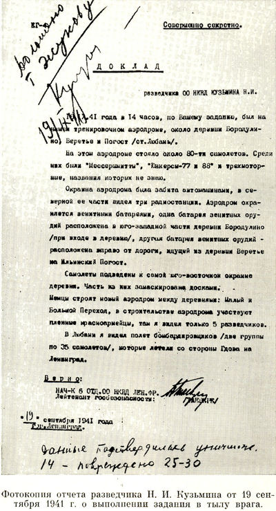 В сентябре 1941 г группа Н.Кузьмина, пройдя по тылам противника из Колпино до Любани, обнаружила несколько секретных вражеских аэродромов, откуда немцы планировали совершать вылеты для бомбежек Ленинграда. Также группа обнаружила большое скопление немецких войск и техники, двигавшееся в направлении Колпино. Это говорило о планах противника нанести основной удар по прорыву нашей обороны Ленинграда севернее Колпино, что вскоре и подтвердили последующие события на данном участке фронта. После полученных от Николая Кузьмина донесений вражеские аэродромы и позиции дальнобойной артиллерии у поселка Саблино были уничтожены советской авиацией.