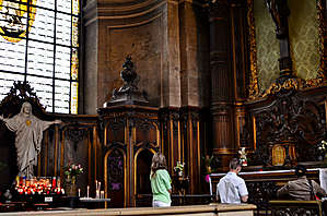 В путеводителе я подивилась на красивую лестницу, но для посещения церковь не отметила. Потому что сначала путеводитель долго и интересно рассказывал про короля Хлодвига с 486 по 511 год и ценности той эпохи, которые варварски уничтожили в 1793 году. И чудом сохранившуюся парочку обломков тех реликвий поместили за алтарем Сент-Этьен-дю-Мон. А потом занудно-витиевато про оригинальность фасада и интерьера… Я даже процитирую «Интерьер храма, в продолжение игры стилей, отличается необычайным своеобразием. Готика ярко выражена в трех нефах с трансептом с их ребристыми сводами, стрельчатых окнах, богато украшенных витражами XVI-XVII веков и в высоких колоннах цилиндрической формы, поддерживающих идущие над аркадами галереи». С ума сойти, да? И вот так много абзацев! При этом даже нет точной уверенности кто автор некоторых из талантливых красот. Нееее, не пойдем. То есть, я так решила, и тут же забыла. Зашли. Случайно)).
