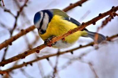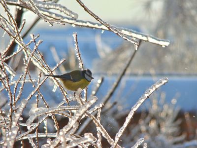Маленький вес позволяет изящной лазоревке усесться на самой тонкой веточке и проверить,