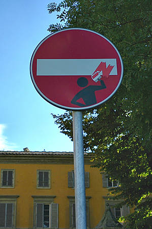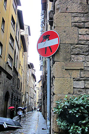 Флорентийцы — молодцы. Очень творчески подошли к таком неприятному знаку, как "кирпич". Вроде и надо туда проехать, а нельзя. Зато можно объехать и подъехать беспрепятственно с другой стороны. Беспрепятсвенно — это насколько возможно, с учётом ширины улиц города средневековой застройки :)