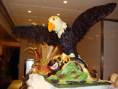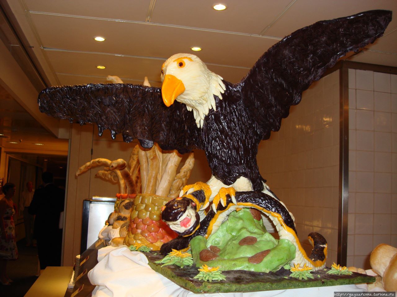 Потом ужин, конечно. После него концерт. Везде побывали, день длинный получился, надо бы и баиньки уже… Но мне неймется. Уговорила Лену пока мы в бальных платьях сходить еще пофотографироваться. Вот, например, на сцену, которая на палубе около бассейна расположена, залезть. Звезда да и только. Потом через Лиду (помните, она же тренаЖОРный зал?) пошли уже вроде в нумера… но такой удобный момент! Здешний состав поваров, видно, на выпечке специализировался и все «прилавки» были ей украшены. Фотоаппарат в руках, народу – никого, все условия. Вон какие шедевры!. .