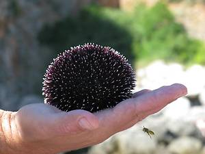 Это морской ёж. Его поднял с глубины Адриатического моря — на борт яхты — наш капитан. У него (у капитана) библейское имя — Лука. А ежа никак не зовут. Просто ёж. По берегу водятся чёрные ежи. А таких красавцев — "баклажановых", как на фото — можно сыскать только на глубине. Это под силу исключительно опытным ныряльщикам. После единственного фото я попросила Луку отправить ежа быстренько обратно в море — домой. Вообще-то и нечего было его тревожить, этого милого ежа (или ежиху...). Но так уж человек устроен — до всего ему есть дело...