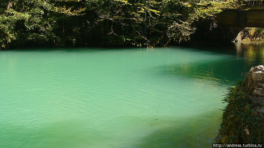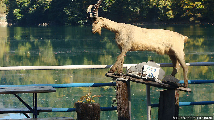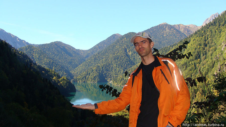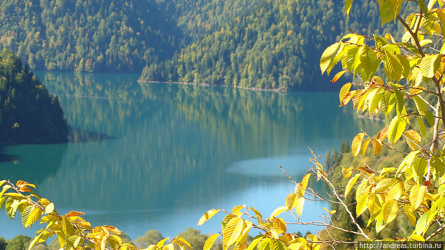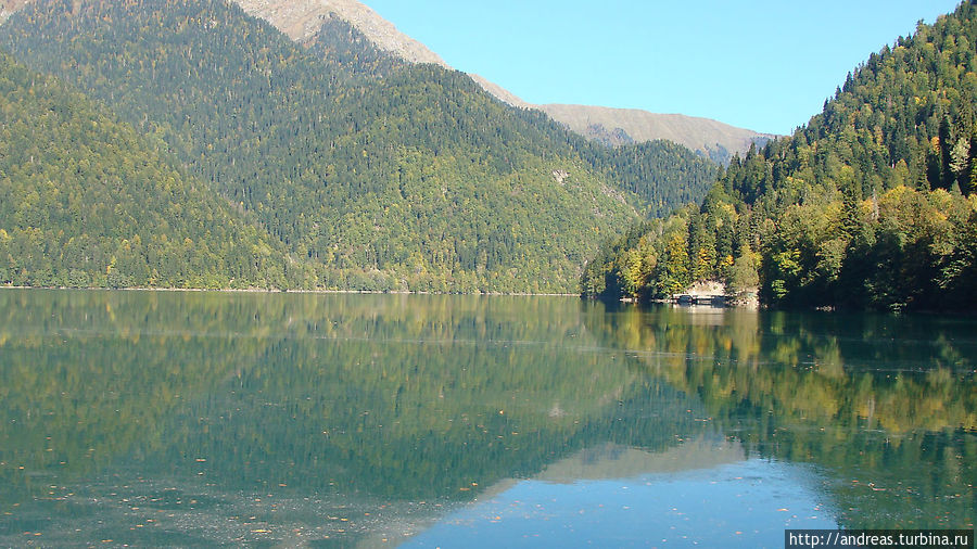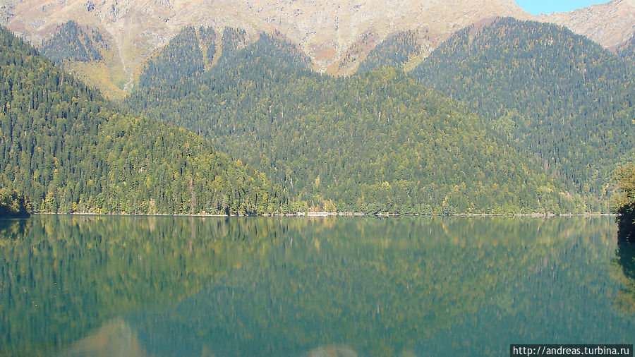 Наконец взору открылся прекрасный вид на озеро Рица! Это визитная карточка Абхазии и её водяное сердце. Озеро находится на высоте 950 метров над уровнем моря и окружено со всех сторон горами, поросшими густыми лесами, с максимальной глубиной 130 метров, с береговой линией 6250 метров. Озеро Рица занимает часть долины реки Лашипсе. Помимо Лашипсе в него впадают пять рек, из озера вытекает единственная река Юпшара. Вода в озере никогда не замерзает, максимальная температура воды регистрируется в августе и составляет 17 — 20 градусов. Вода озера насыщенного зеленовато-голубого цвета, ее прозрачность достигает 8-10 метров. В озере обитает один вид рыбы — ручьевая форель. Смотрим...