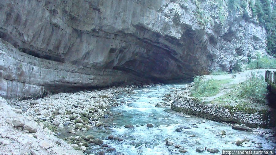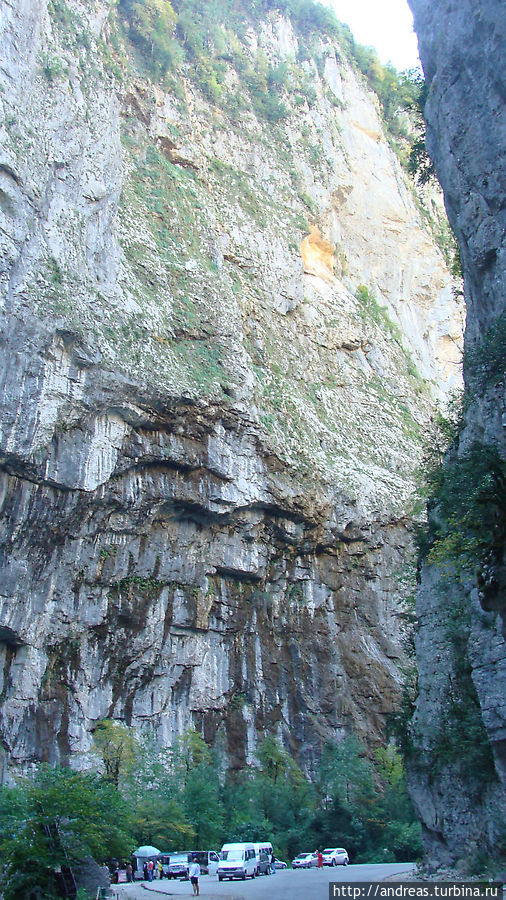 На 30 км мы въезжаем в грандиозный Юпшарский каньон и осматриваем Юпшарские ворота. Это самое узкое место на Рицинской дороге. Расстояние между скал составляет 20-25 метров. Заметно темнеет и холодает. Солнце здесь бывает в среднем только 3 часа в день. С отвесных полукилометровых карнизов свисают зеленые и красноватые мхи.