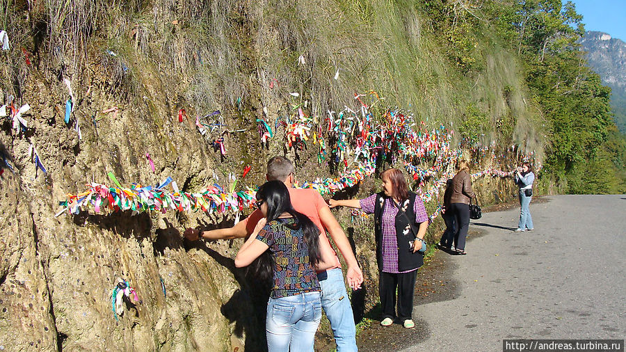 На Рицинском шоссе попутно было сделано несколько остановок, входящих в программу экскурсии. Первая остановка — это водопад "Девичьи слёзы". Он находится в начале дороги на озеро Рица, на правом берегу реки Бзыбь. Водопад образован талыми водами с альпийских лугов, фильтрующимися сквозь толщу известняковых скал. Эти струи и образуют рядом с шоссе прозрачную, искрящуюся на солнце водяную решетку.