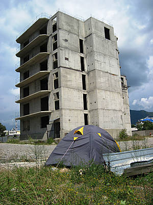 Пока мы фотографировали, погода испортилась: поднялся холодный ветер и заморосил противный мелкий-мелкий дождь. Под моросящим дождиком складываем палатку и утрамбовываем рюкзаки. Заходим с рюкзаками в недостроенные многоэтажки, решаем подождать, пока дождь поутихнет.