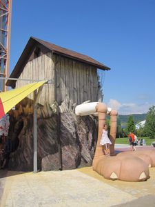 Однако же не столько ради этого пишу сию заметку. Главное в парке — это, несомненно, его три умопомрачительных аттракциона — экстримальный сверхскоростной лифт "Жар-птица" и 2 американские горочки "Квантовый скачок" и "Змей Горыныч". Вот этот коварный трехголовый зелёный змий и очаровал меня по самое "нихочу". За счет большого размаха железнодорожной трассы, по которой пулей пролетают составы вагонеток с людьми, и получаешь всю гамму острых ощущений. Прям дух захватывает, когда тебя не только закручивают в мертвую петлю, но еще успевают обернуть несколько раз вокруг рельсов. Наверное, поэтому больших очередей у этих ударных аттракционов и нет. И это к лучшему! По крайне мере, для меня и подобных мне!