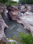 Особенно красиво этот коридор выглядит на последнем, нижнем участке, где обнажаются старые подземные русла. Свою дорогу Белая прокладывала в течение тысячелетий не только на поверхности, но и в глубине известковой толщи, образовавшейся на дне верхнеюрского моря 130-120 млн. лет назад. Сейчас юрский известняк залегает наклонно, то опускаясь в глубь земли, то выступая на поверхность. У поселка Каменномостсковый известняк находится на уровне русла реки. Благодаря множеству трещин в известковой толще, а также способности известняка к медленному растворению под действием воды здесь и образовалась такая затейливая теснина. Здесь можно увидеть настоящий лабиринт из вымытых в известняке пещер, нагромождений камней и причудливых мостиков, которые, видимо, и дали название каньону. Каньон здесь шириной около 5 м, а высота скал над ним 25-30 м. Поэтому в каньоне всегда мрачно, даже в полдень нет солнца, а от скал веет влажной прохладой. На отвесных берегах висит угрюмый мох. Зато Белая течет тихо-тихо, как будто устав от предыдущей битвы.