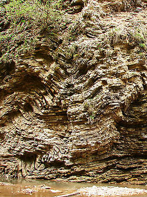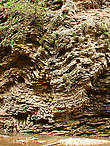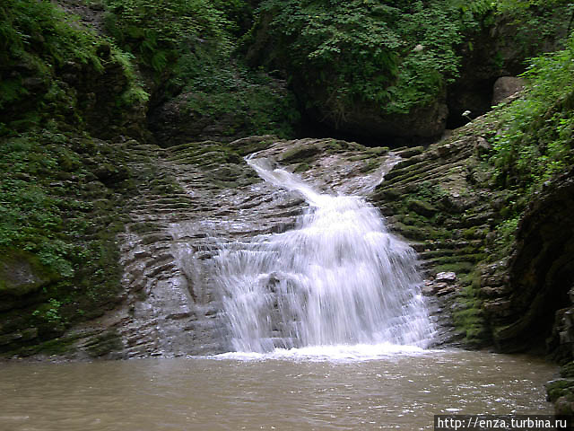 Дальше тропа выводит к удивительно изящному водопаду Шнурок. Здесь ручей тонкой лентой срывается с 15-метровой высоты в небольшой, но достаточно глубокий водопадный котел. С высоты верхнего уступа озерцо внизу кажется безмятежным на фоне бурной, падающей воды. В этой чаше вода медленно крутится, затем достигает края уступа и по ребрам тонких пластов известняка, словно по ступенькам, каскадом устремляется вниз. Справа от Шнурка можно найти толстое бревно с металлическими штырями, заменяющими ступени.