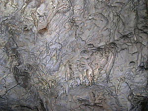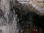 Вход в пещеру образовался в результате обвала части кровли верхнего зала. Вниз ведет металлическая лестница. И сразу начинается настоящая сказка. Натеки на потолке медленно превращаются в маленькие сталактиты. А через огромное время из них вырастают огромные, свисающие с потолка «зубы».
