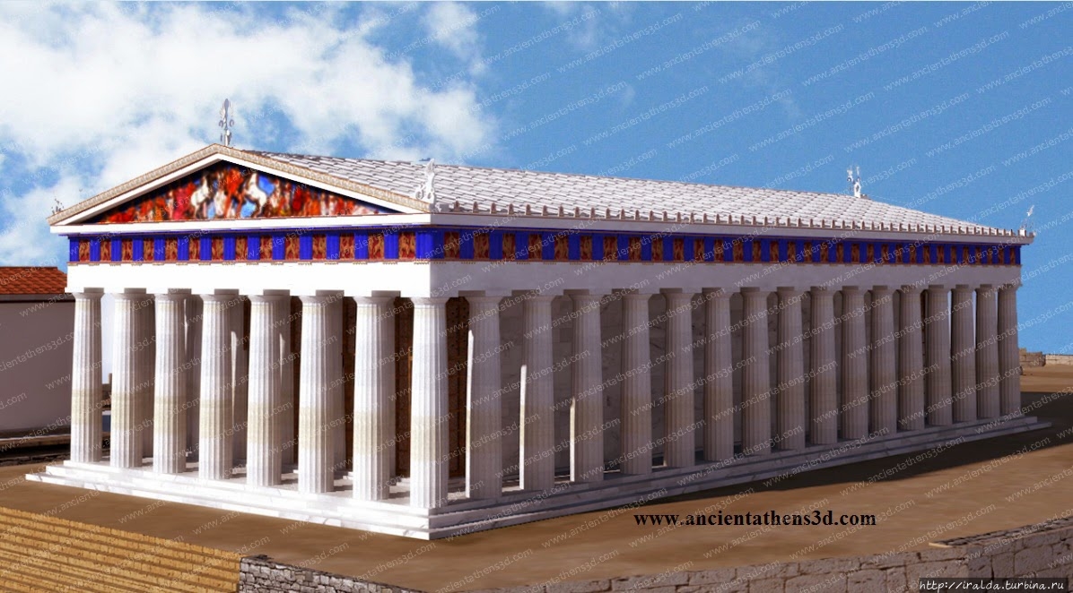 Парфенон выделялся своей роскошью и парадностью. Если вы думаете, что античная архитектура и скульптура имели натуральный цвет материала, из которого они строились или изготавливались? То спешу вас огорчить- девственная чистота поверхности античных скульптур абсолютно не соответствует действительности. Греки любили все раскрашивать!