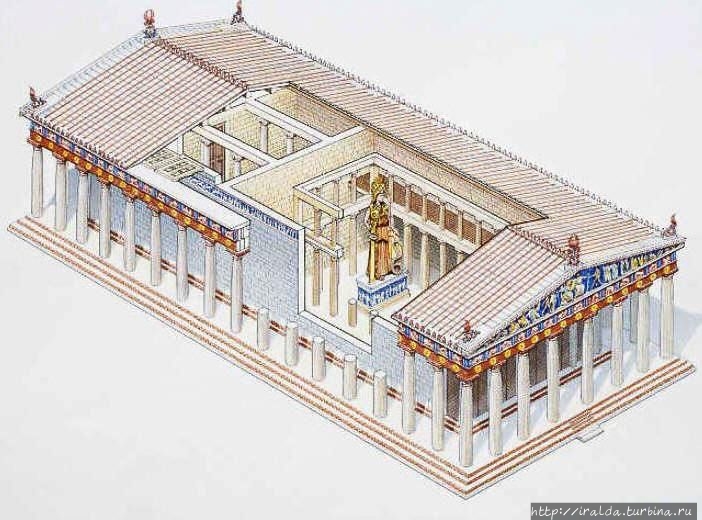 Внутри храм был разделен на две неравные части. В главной находилась статуя Афины Парфенос (Девы) из золота и слоновой кости работы Фидия. Меньшая, следовавшая за главным помещением храма служила местом хранения государственной казны Афин и называлась первоначально Парфенон. Лишь позже, в четвертом веке до нашей эры это название распространилось на весь храм. (фото из Интернета)