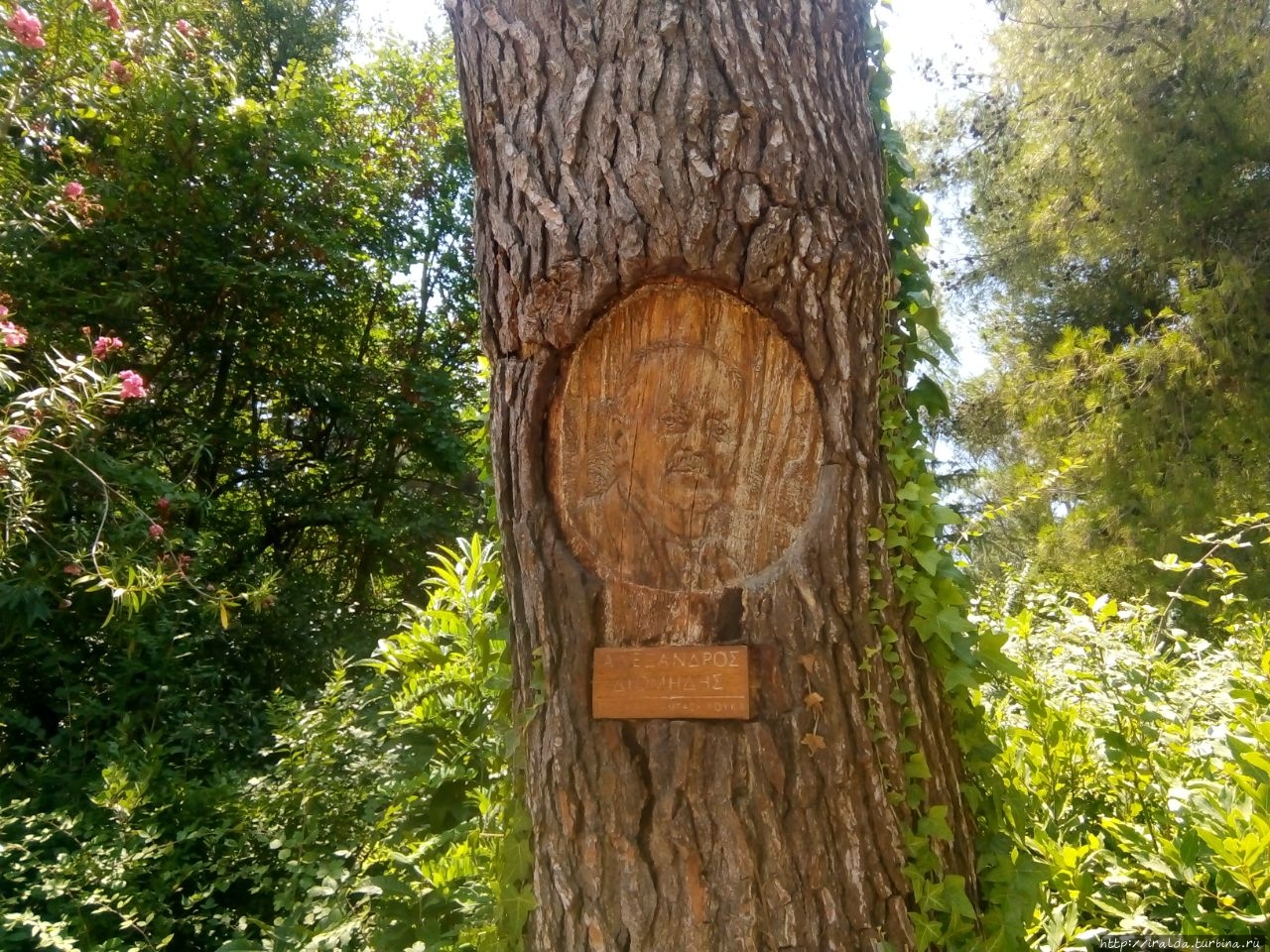 по инициативе которого в 1951 году он был заложен. Вот его и портрет, высеченный на стволе дерева.