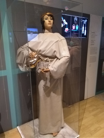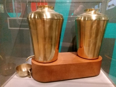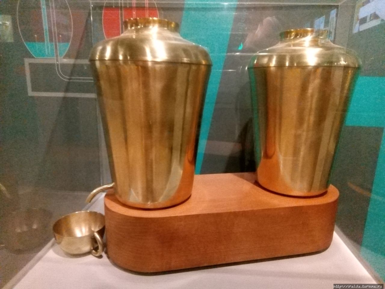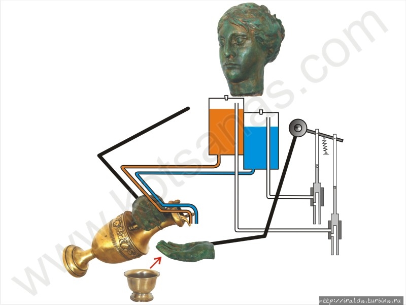 Как только на одну руку ставилась чаша, другая рука, держащая кувшин с вином и водой из двух не сообщающихся емкостей, наполняла её. На фото видны две выходящие трубочки — для вина и для воды. Под одеждой была спрятана вся конструкция этой милой дамы. (фотография из Интернета)