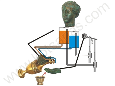 Первый в истории торговый аппарат Герона, который устанавливался в храмах. Для того, чтобы выпить святую воду, надо было бросить монетку и после этого из краника вытекала порция воды, соответствующая весу монетки. youtu.be/jAhUbfQx56c