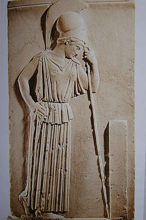 Богиня изображена на рельефе в аттическом дорийском пеплосе и коринфском шлеме,