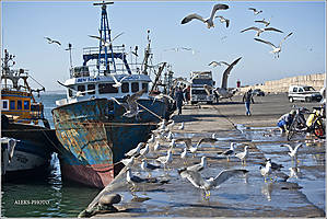 Сопровождающий нам был не нужен, — мы сами набрели на фишмаркет, хотя порт довольно большой по размерам. Ориентиры просты — сильный запах рыбы и сотни кружащихся чаек, которые здесь не самые толстые. Позже, в других городах, мы увидим чаек гораздо более крупных размеров, отъевшихся на сардинах. Гулять по фишмаркету желательно в бахилах, о чем мы вовремя не сообразили. Поэтому пару следующих дней от нас воняло, как от работников Агадирского консервного завода. Но после Варанаси в Индии, где у нас обувь два дня воняла коровьим пометом, а мы при этом летели в самолете, это было уже не страшно...
