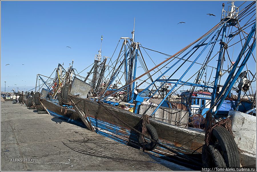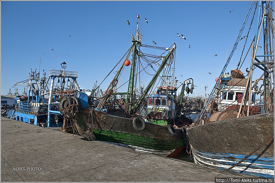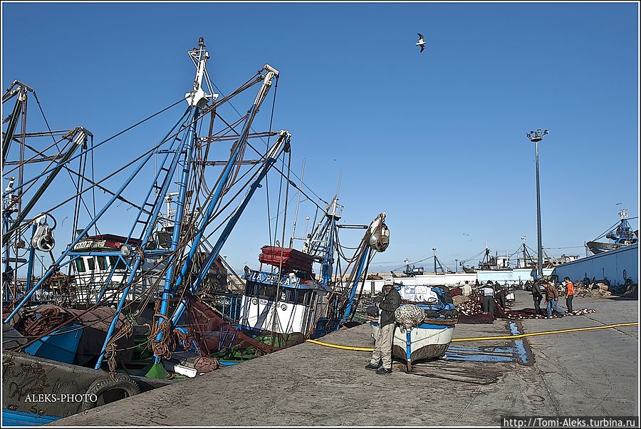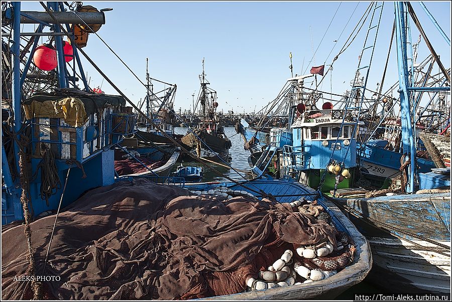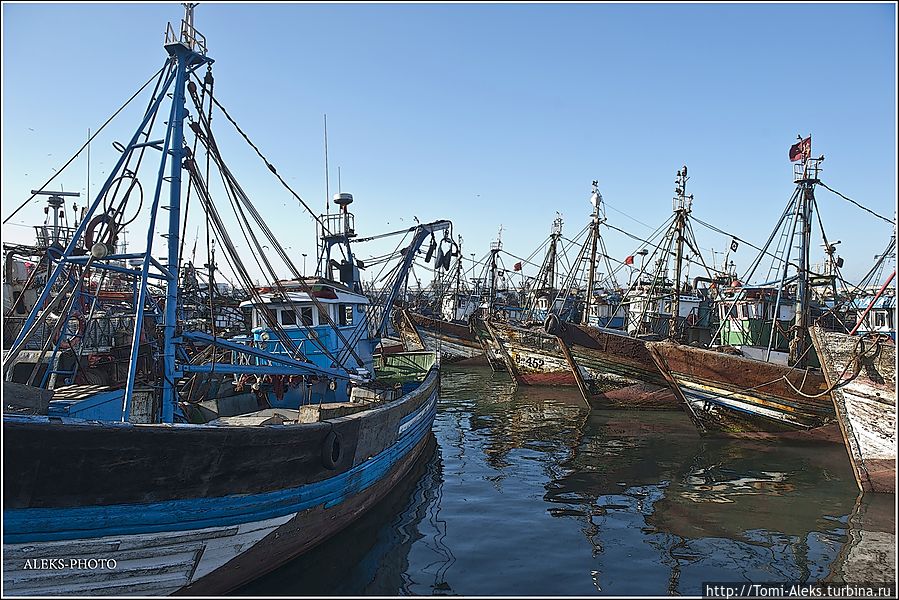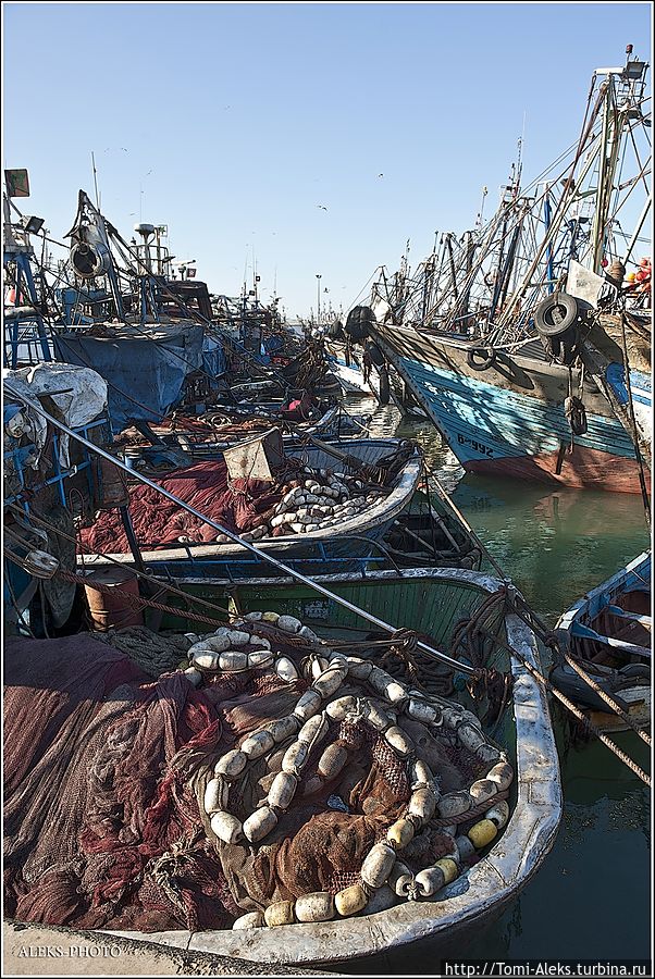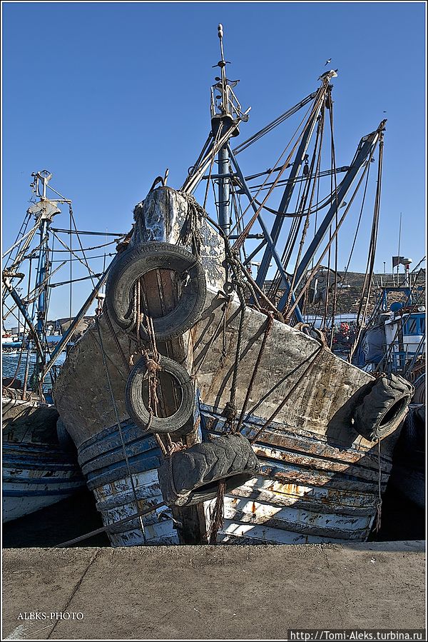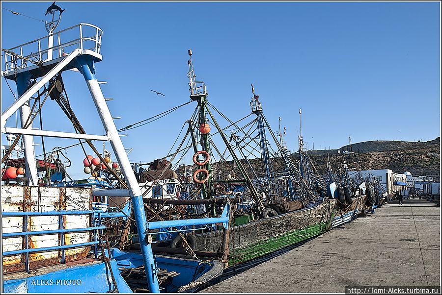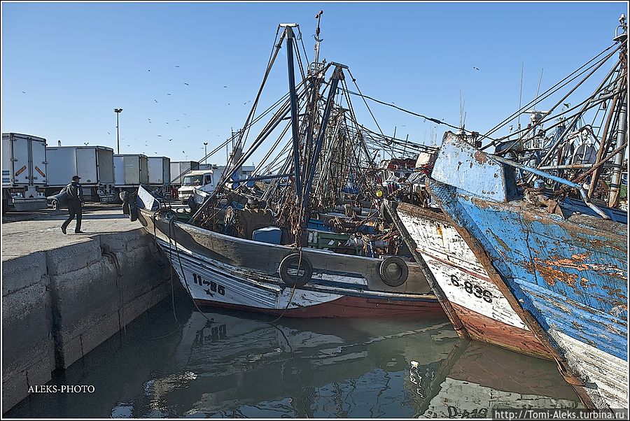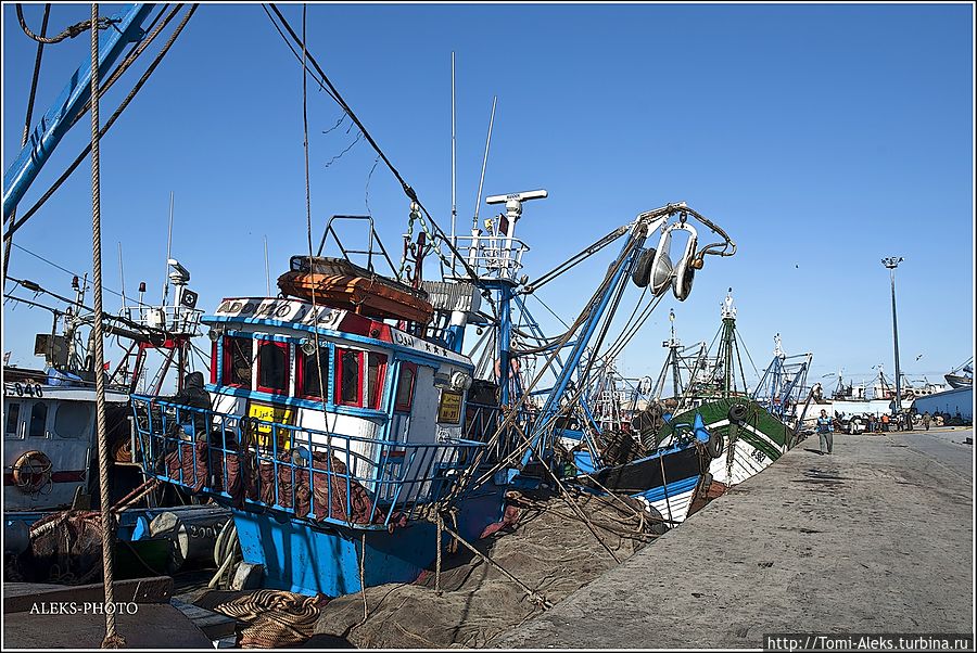 Читая все это, как-то становится не до романтики. Это же такой труд, но в то же время он кормит семьи рыбаков. Но главное — моряки-трудяги не мешают любопытным туристам ходить и щелкать своими фотиками во всех портах страны. Видимо, их берет гордость за родную рыбную промышленность. Короче, хватит рассуждений и сентиментов. Посмотрим, на чем марокканцы ловят рыбу в Атлантике. Интересно, что когда мы проходили ворота порта, я не успел убрать камеру. Охрана сразу поинтересовалась, являюсь ли я прессой. — No, my friend, — ответил я. — To take а photo — it's my hobby! На что он махнул рукой, мол, — вали дальше в порт, раз ты просто любознательный турист. Так мы оказались среди пропахших рыбой кораблей...