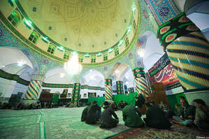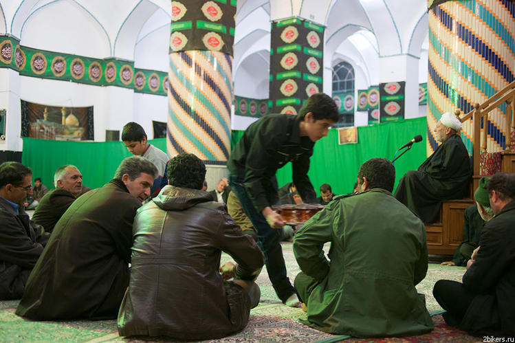 Затем все потянулись внутрь мечети, на чтения повествований о страданиях имама Хуссейна, его семьи и сподвижников. Женщины и мужчины, разумеется, с разных входов, но в один зал, просто с ширмой из-за которой с женской половины периодически выбегали веселящиеся дети. На мужской половине же всё очень серьёзно, все чинно расселись по периметру и возле колонн, лишь небольшая группа, видимо старейшины, вокруг помоста муллы. Старейшины в соответствующих паузах задавали вопросы, и театрализованно спорили о сути того или иного события, упомянутого в рассказе. По всей видимости, всерьёз никто спорить не собирался, а все играли свои определённые роли.