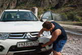 Оказалось, что это горячий источник с запахом сероводорода. По вкусу напоминающий Боржоми. Получается, что мы мыли машину Боржоми? :)