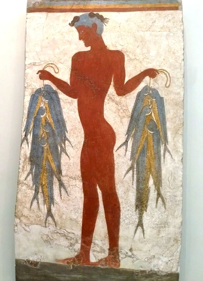 Их сейчас мы здесь не увидим. Большинство выставлено в залах афинского Национального музея и в музее в Фире. Описание живописных фресок, обнаруженных на стенах домов дополняют моё представление. Вот некоторые из них — длинная лента неширокого фриза, опоясывавшего стены третьего помещения, рассказывает о морских и сухопутных сражениях, о многолюдных городах, расположенных на берегу моря, по которому плывут пышно украшенные корабли. На других фресках предстают жители этих городов — стройные юноши-рыбаки со своей добычей, пышно одетые женщины, собирающие цветы или несущие дары.