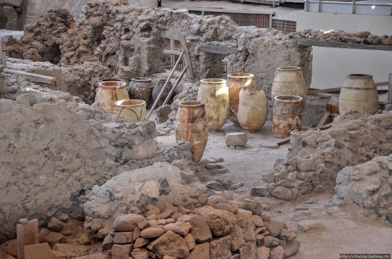 Позже, при посещении музея в Фире, я увижу поразительные фресковые росписи, сохранившие всю изначальную свежесть красок. А пока я брожу по этим улочкам древне минойского города. Найденные находки критской культуры времени ее наивысшего расцвета, отличаются большим своеобразием, лёгкостью декора, разнообразием по форме и по росписи сосудов.