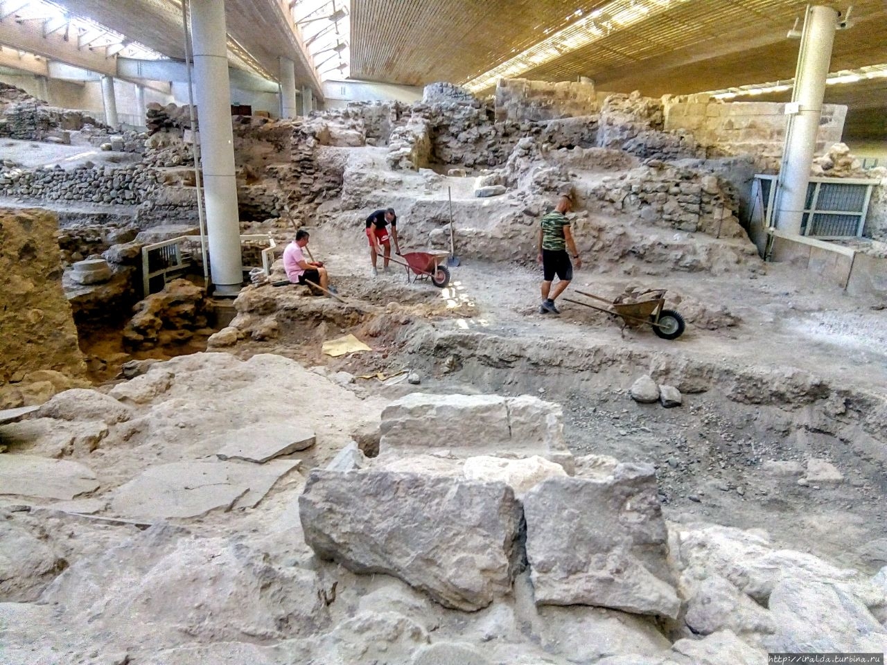 Пробитые в вулканическом 40-метровом пепле туннели привели к остаткам строений в два или три этажа, которые сначала пострадали от землетрясения, а потом сгорели при извержении. Считается, что 40 обнаруженных зданий составляют только одну тридцатую часть огромной территории этого города и что раскопки остальных сооружений, вероятно, займут около столетия. Надо сказать, что работы не прекращаются. И бесконечная вереница тележек, груженная вулканическим пеплом или камнем сопровождала моё пребывание.
