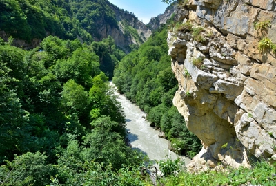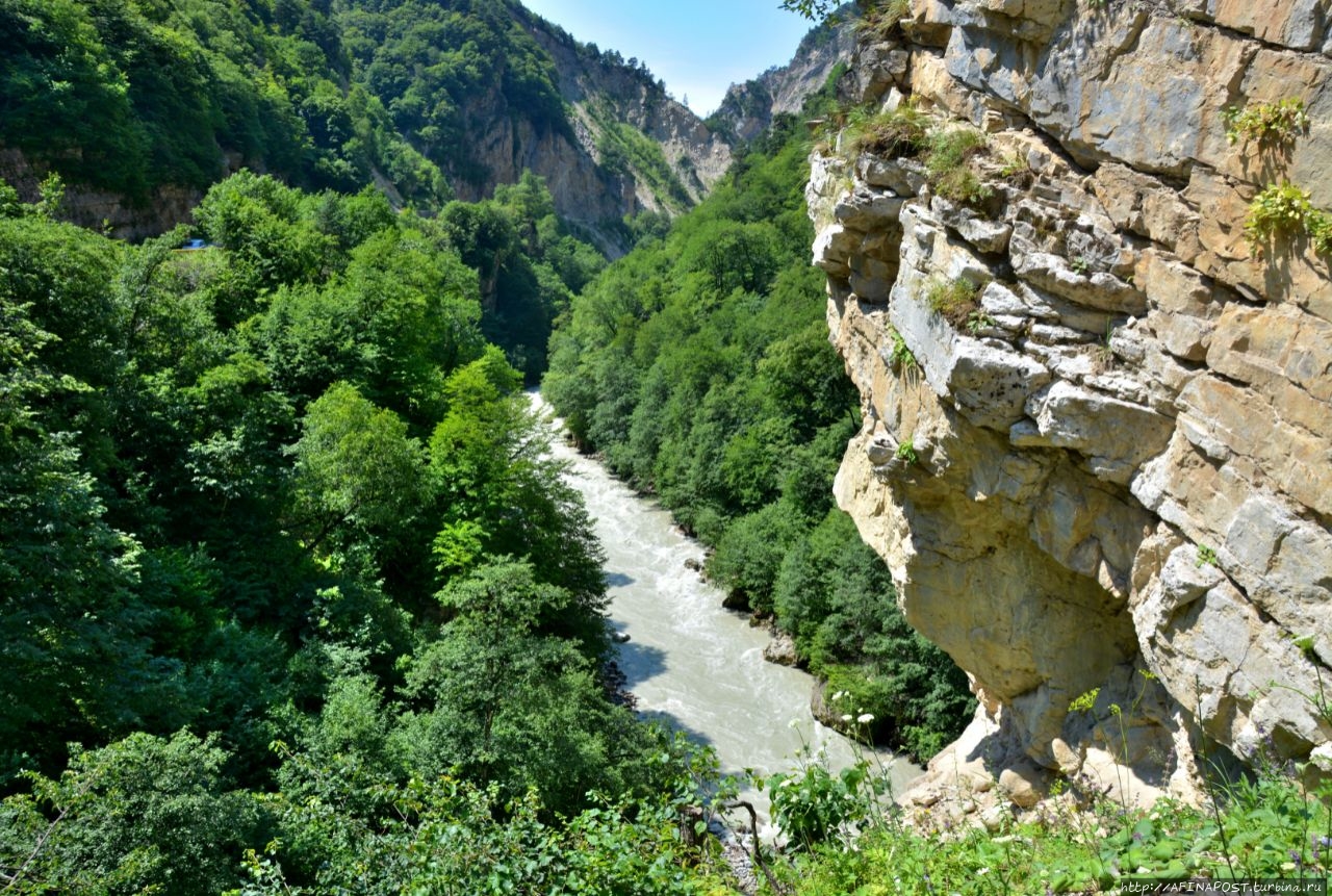 Чёртов мост над пропастью позволяет обозревать каньон Ахсинта в обе стороны. Зрелище с моста открывается такое, что захватывает дух! Под ногами, в 80 метрах, ревёт и беснуется Урух, воды которого скованы отвесными скалами.