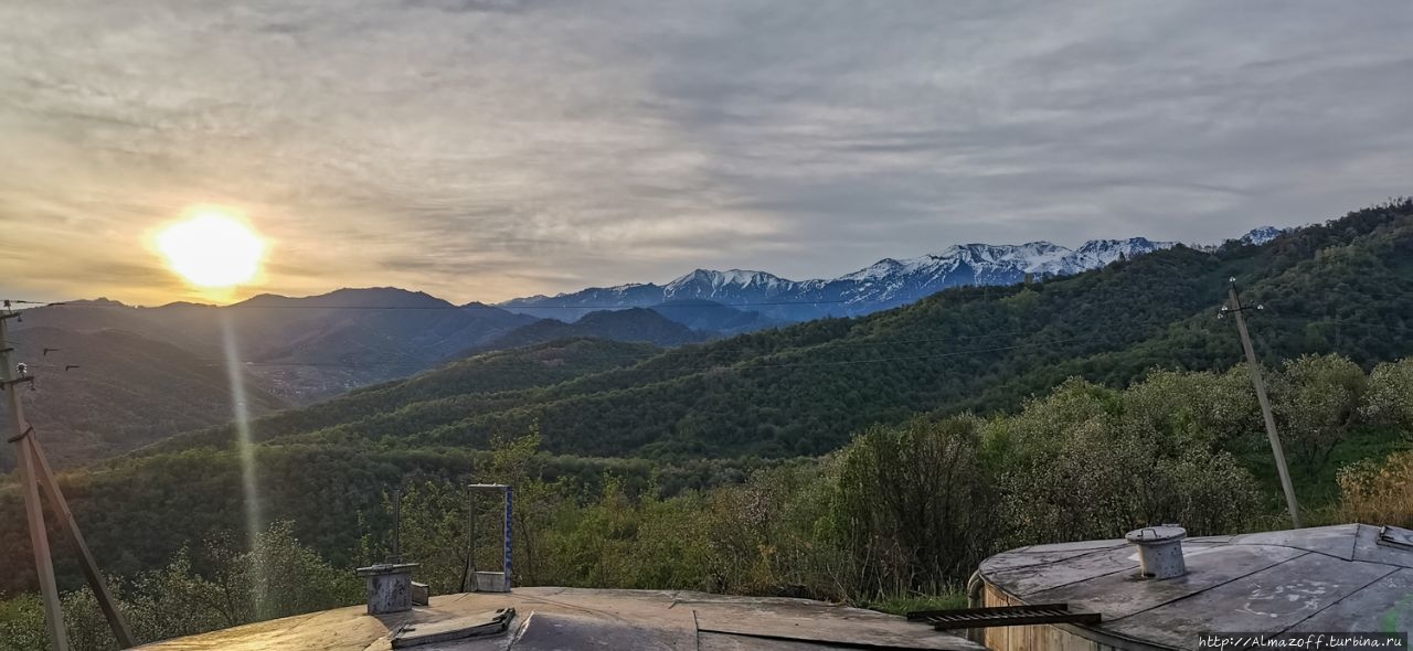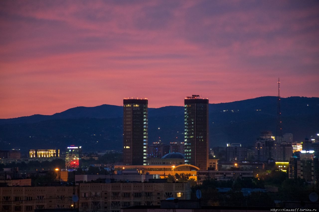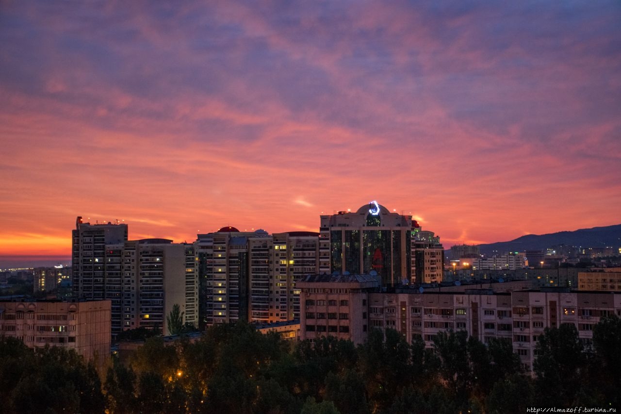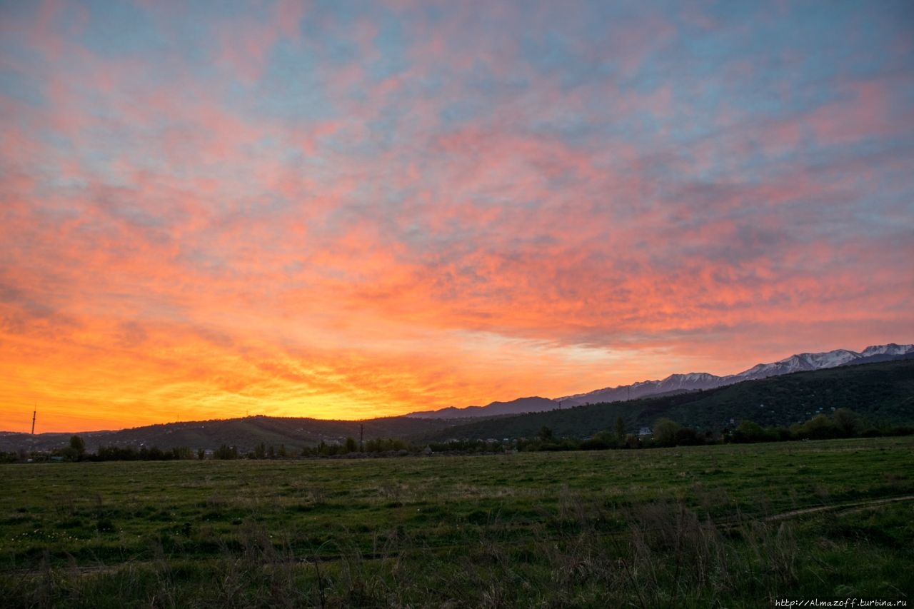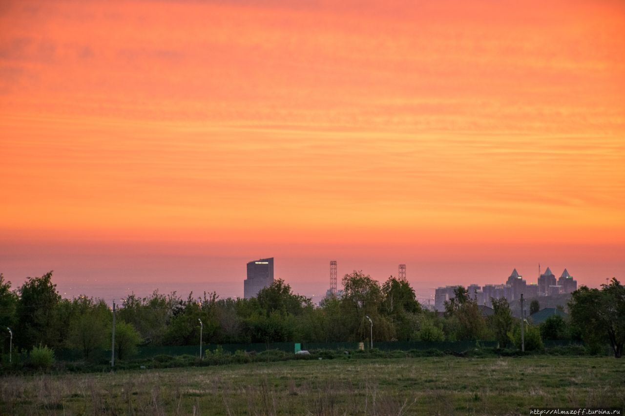 Самая красивая часть рассвета застала нас в дороге и сопровождалась пением петухов и криками павлинов (!). Это всё произошло в районе посёлка Алатау в верхней части города, рядом с предгорьями Заилийского Алатау.