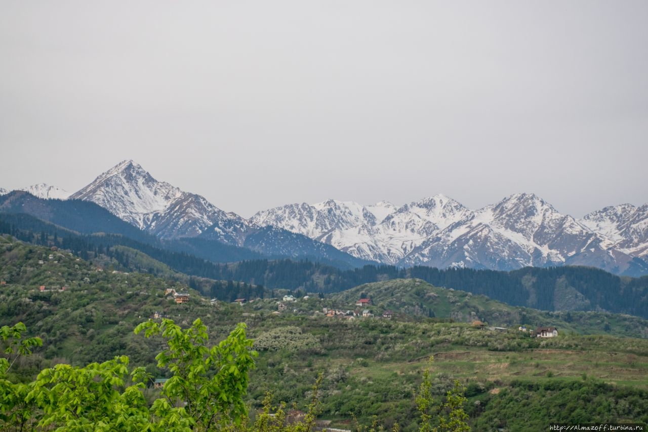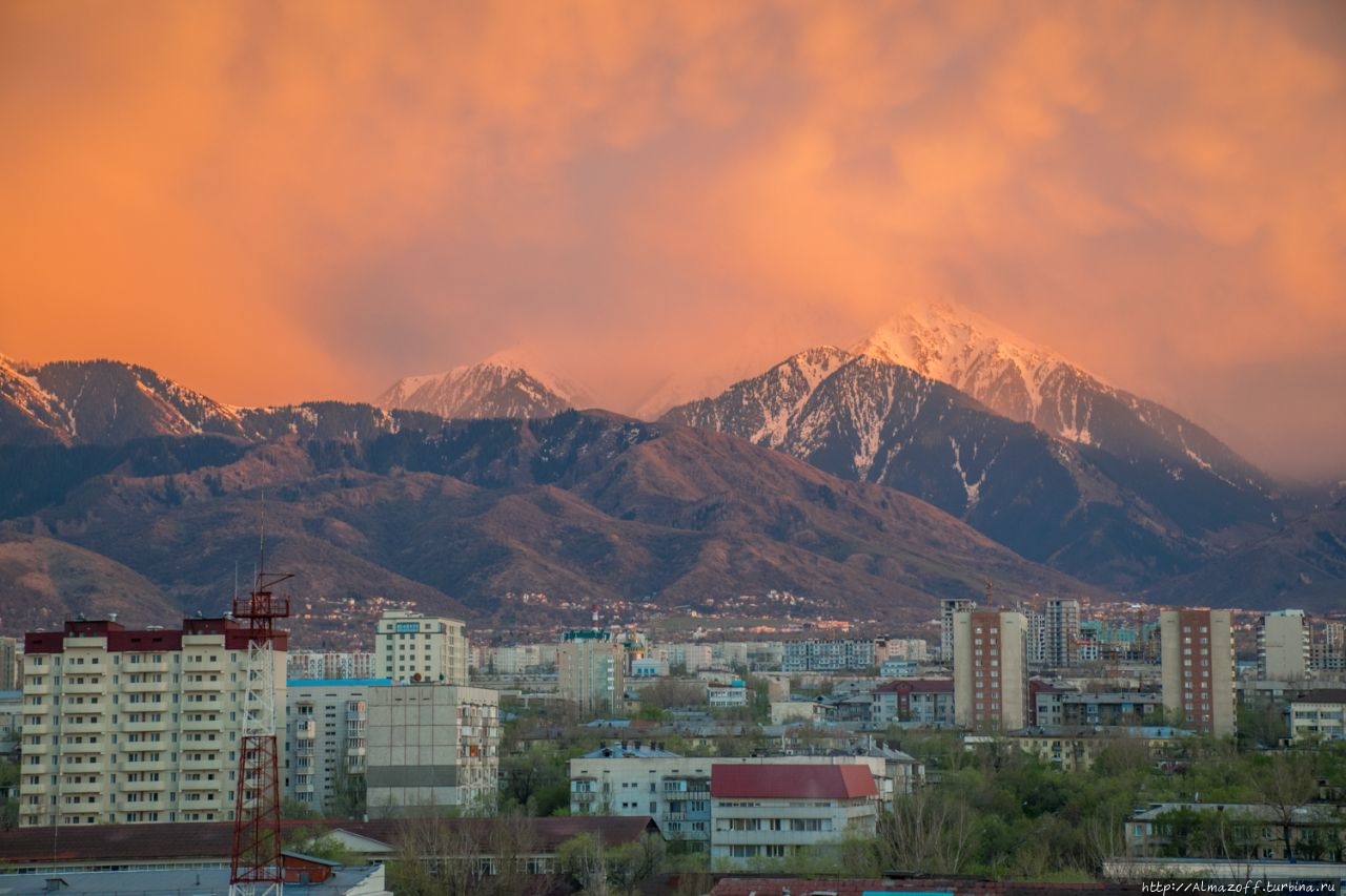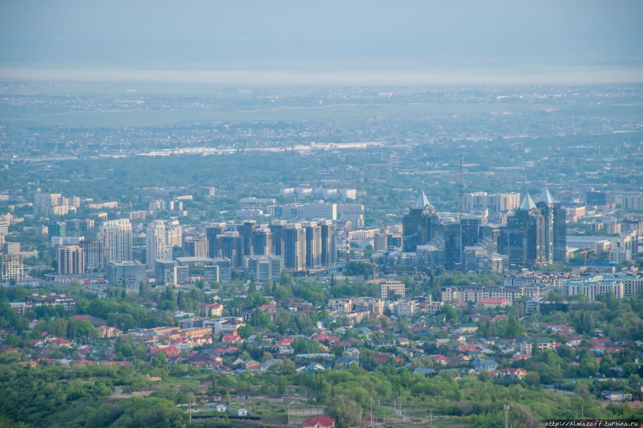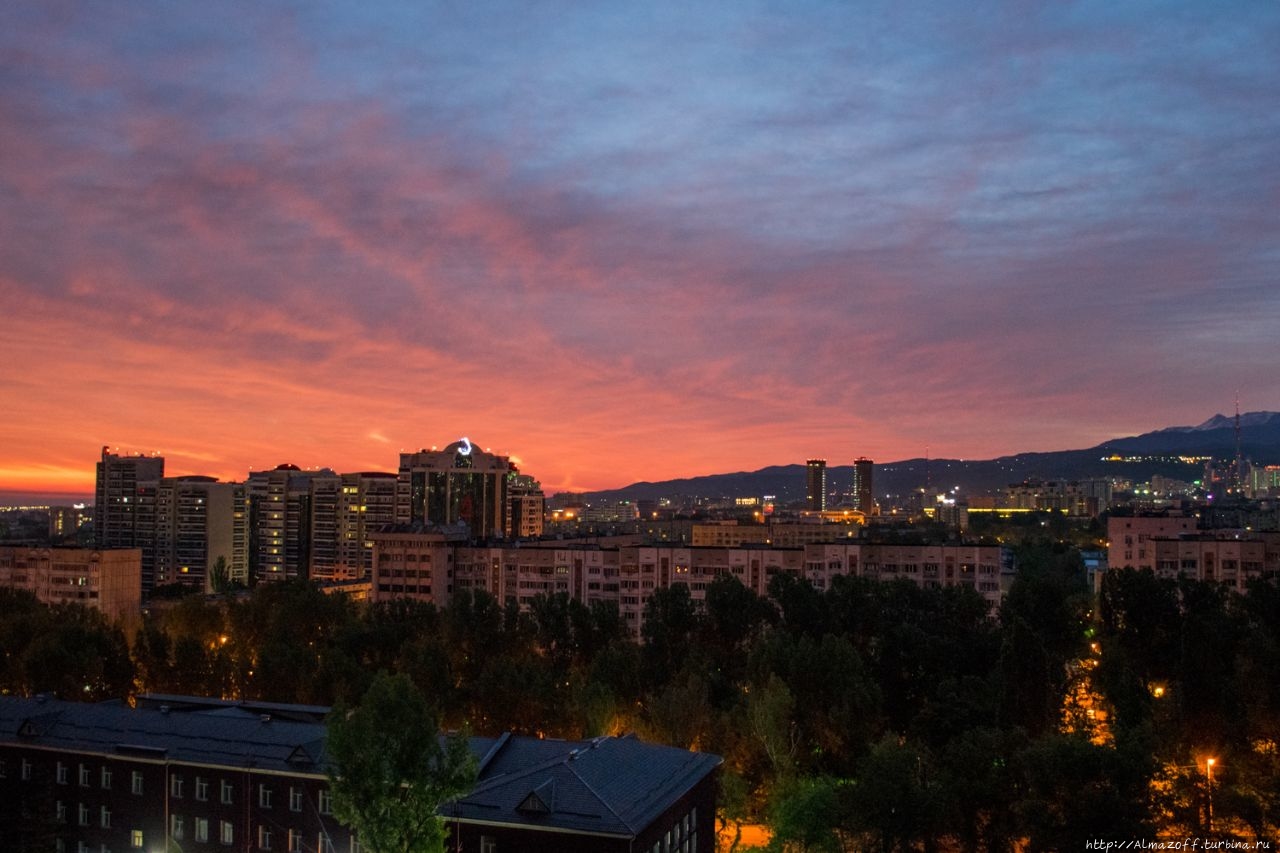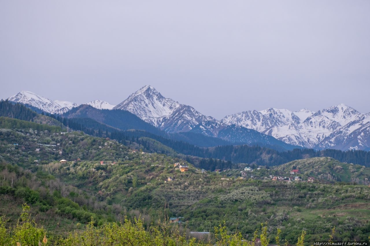 Самая красивая часть рассвета застала нас в дороге и сопровождалась пением петухов и криками павлинов (!). Это всё произошло в районе посёлка Алатау в верхней части города, рядом с предгорьями Заилийского Алатау.