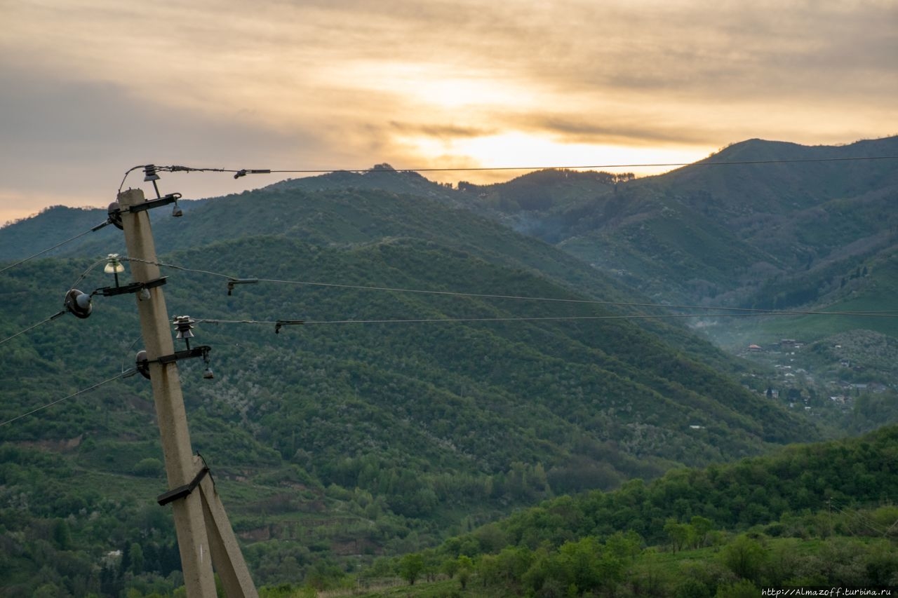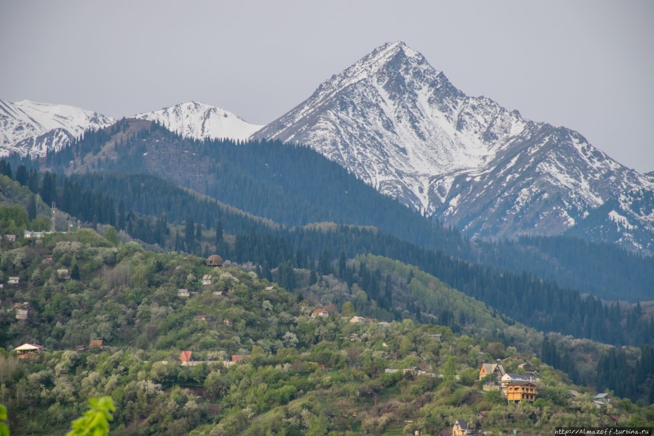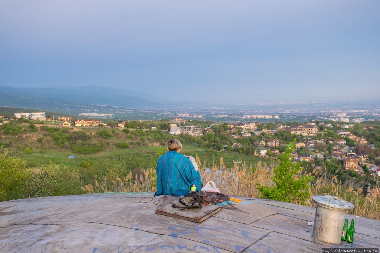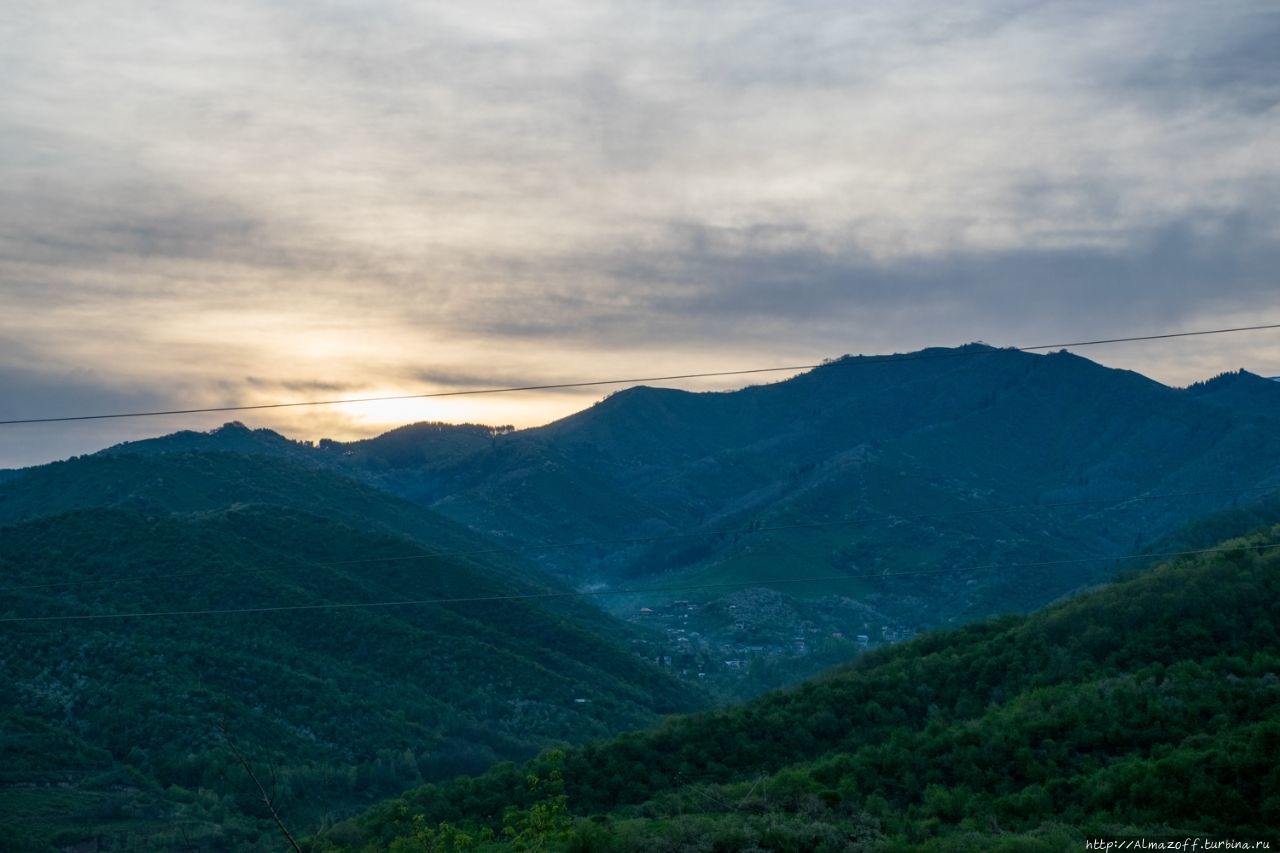 Самая красивая часть рассвета застала нас в дороге и сопровождалась пением петухов и криками павлинов (!). Это всё произошло в районе посёлка Алатау в верхней части города, рядом с предгорьями Заилийского Алатау.