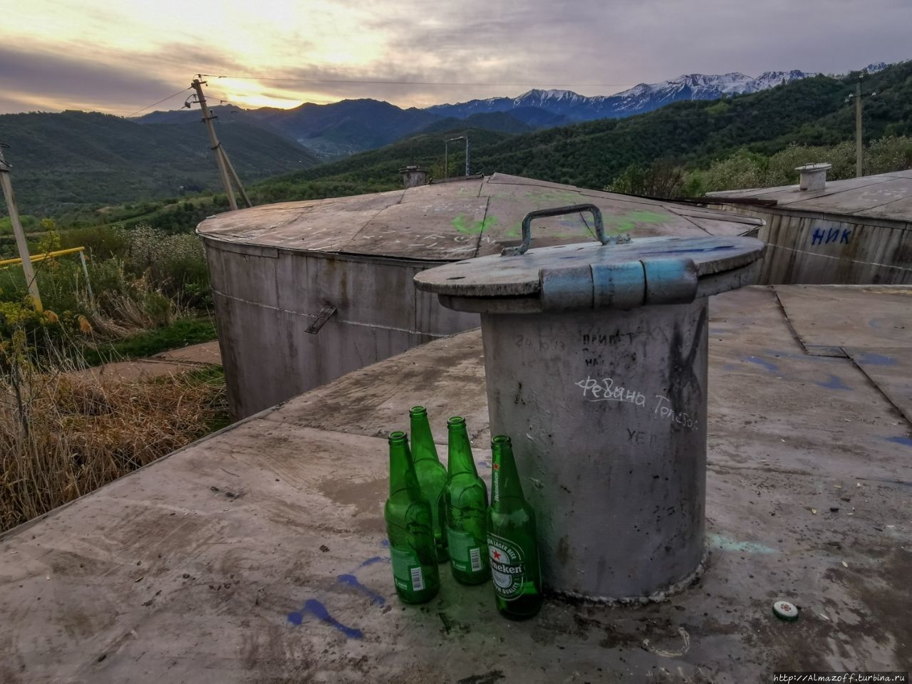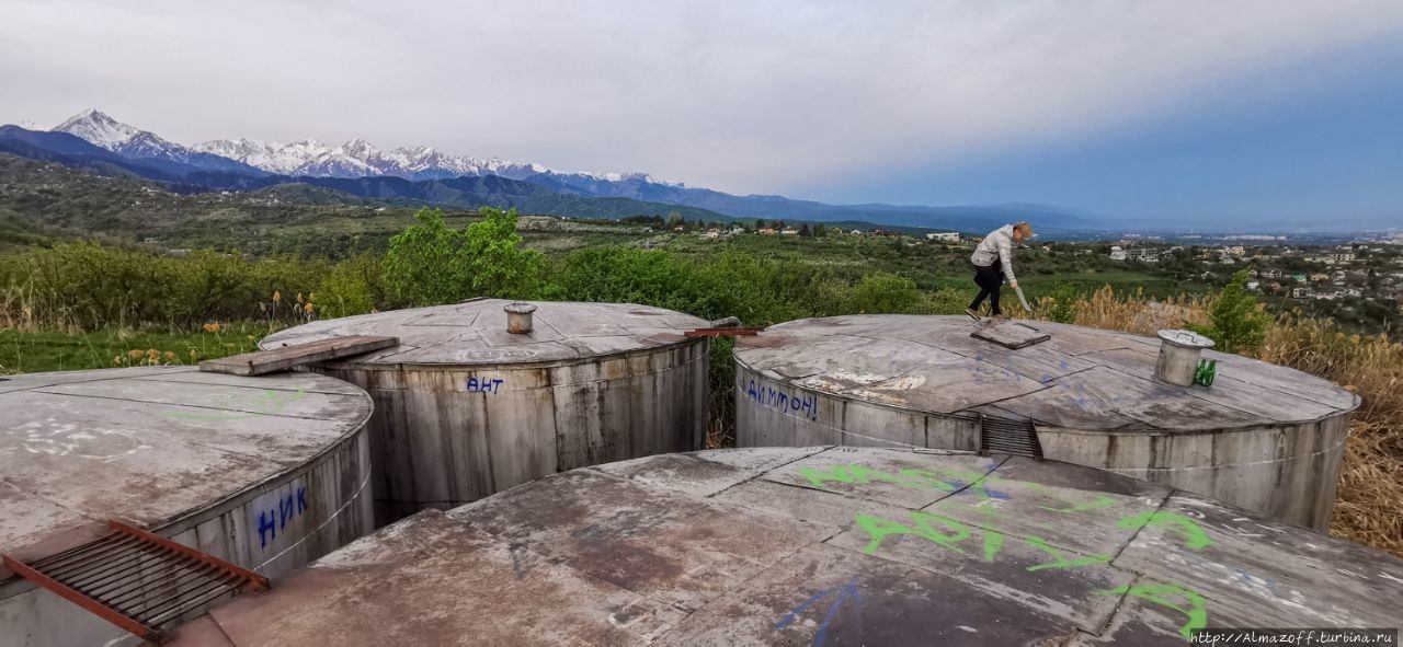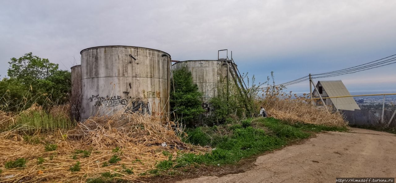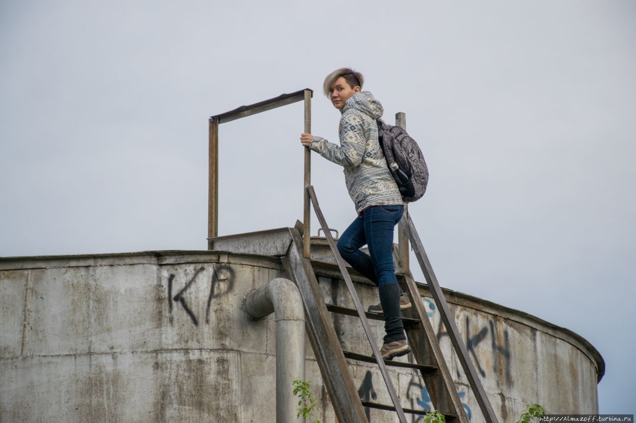 Живописная локация для завтрака была выбрана по совету друзей и подземелий Катиной памяти, она однажды была в этом месте. А именно на четырёх водонапорных бочках, которые находятся над дачным посёлком "Минфин" выше Каменского Плато. В народе их ещё просто называют баками. К ним мы приехали через Ремизовку. Залезть на баки довольно легко по железной лестнице, главное потом с них не свалиться в окружающие кусты. Баки метров пять высотой и без ограждений, зато крыша баков широка и на ней спокойно можно устроить завтрак, солнечные ванны и даже выпить немного пива, как некоторые до нас.