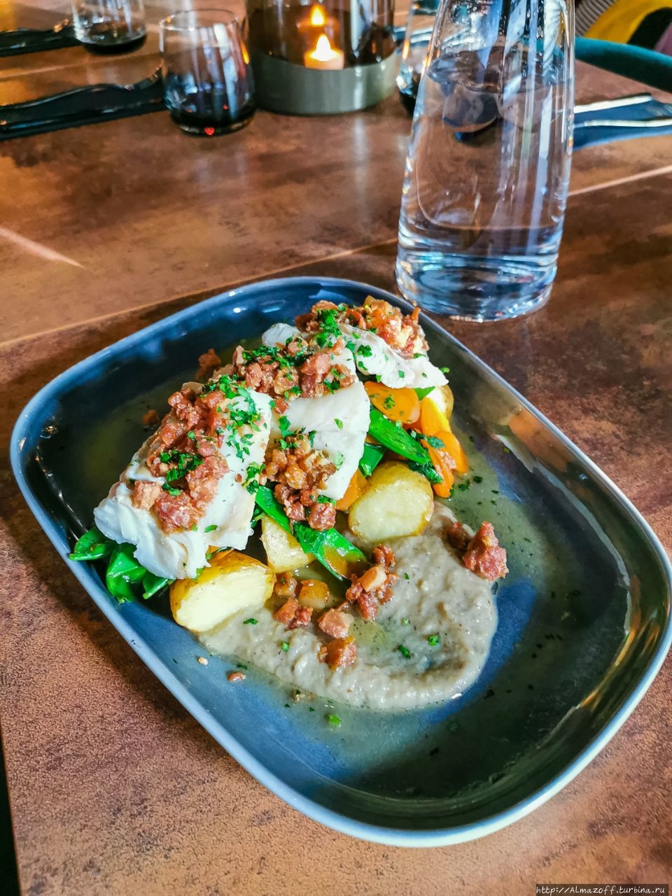 Ну а я хотел попробовать треску и северного оленя. Изучая меню, мой выбор пал на сушеную треску, которая подается с морковью, душистым горошком, пюре из топинамбура, картофелем с амандином и беконом с маслом.