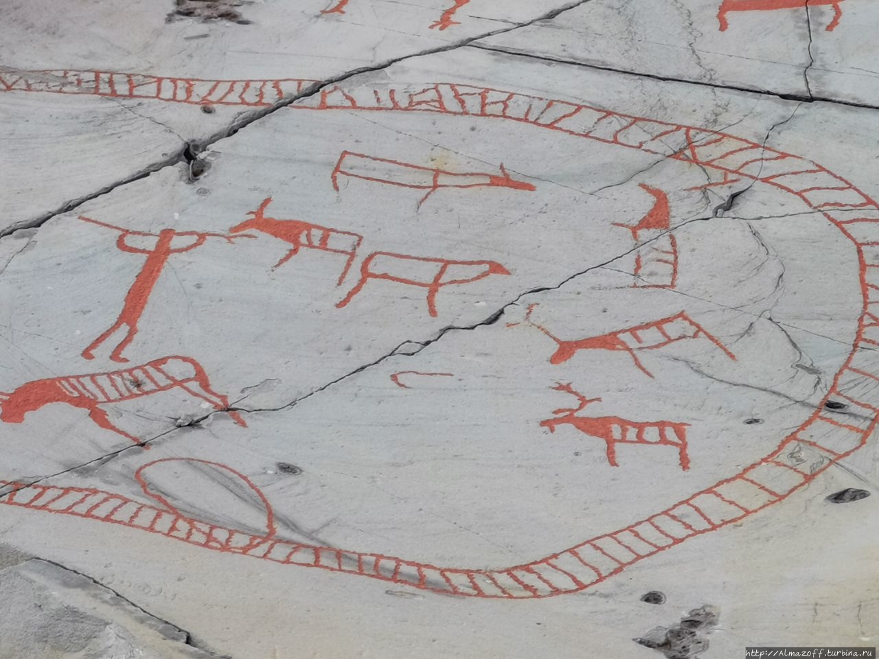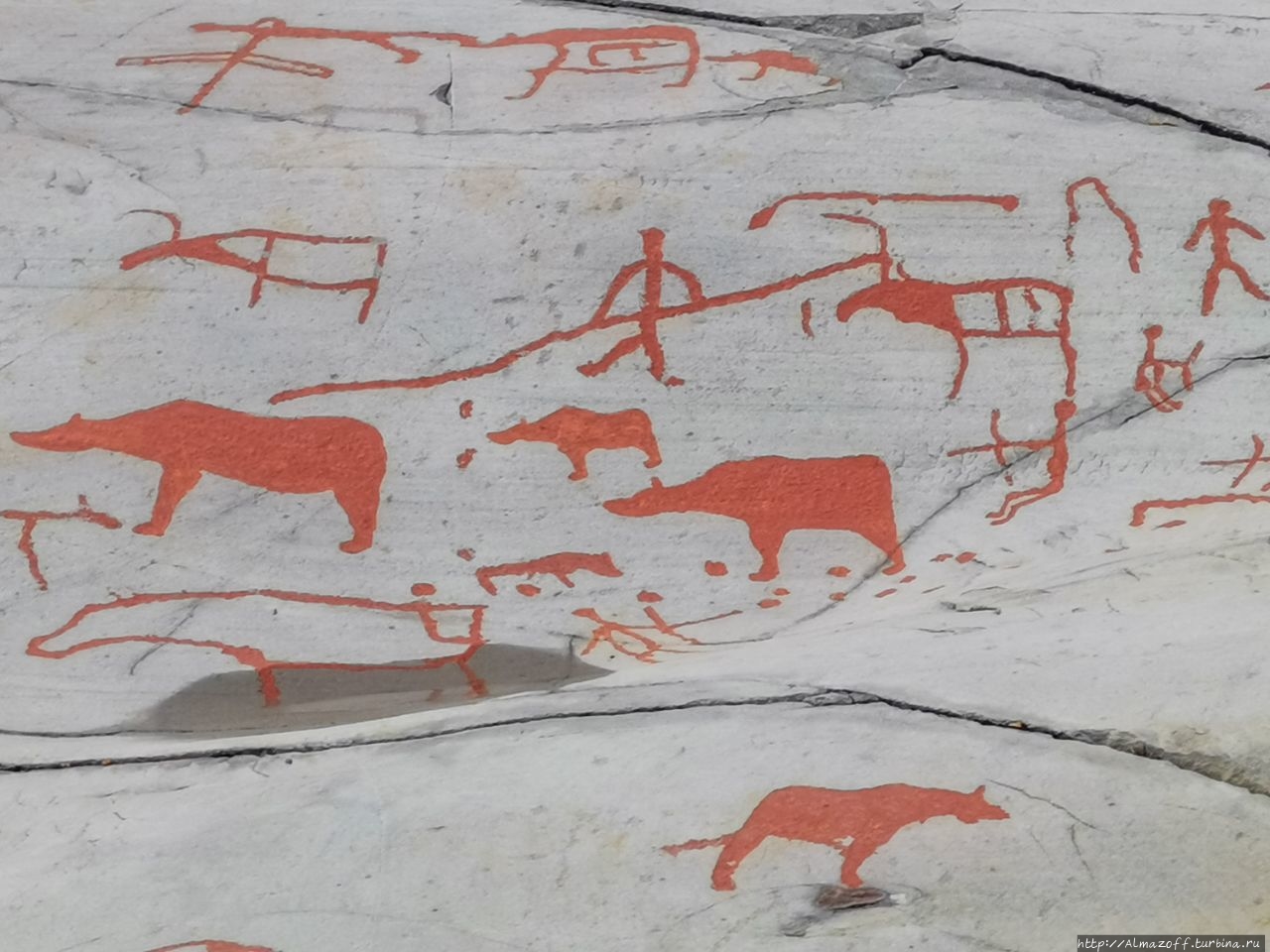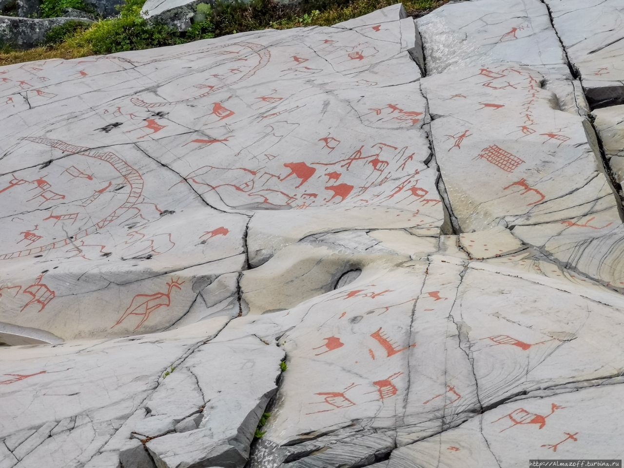 На скальных плитах изображены поездки на охоту, рыбалку и катание на лодках, и, как считается, они представляют микро-пейзажи. Представлен широкий спектр полярной фауны (северный олень, лоси, медведи, рыба, киты, морские птицы и т. д.). Исследования материальной культуры обогащены множеством различных артефактов, показанных на скалах. Хорошие условия хранения позволяют изучать произведения наскального искусства.