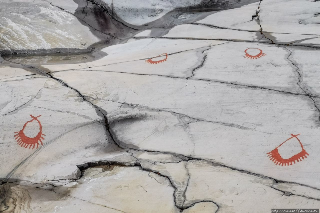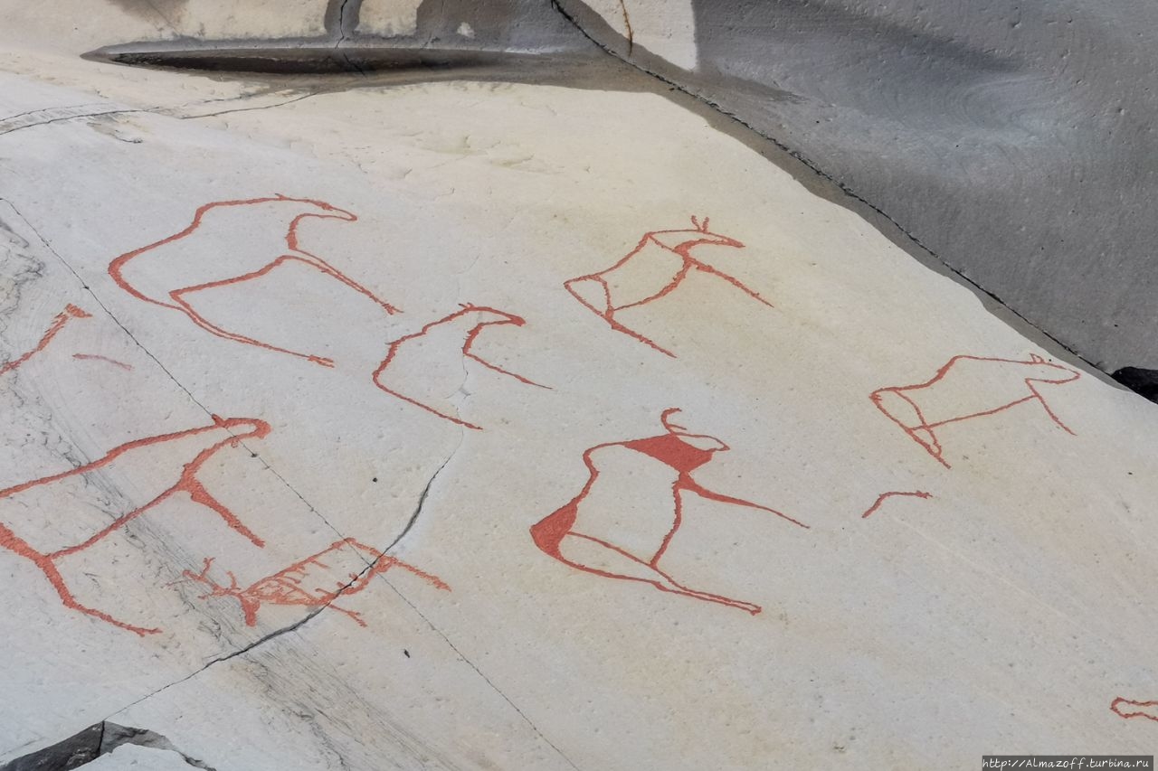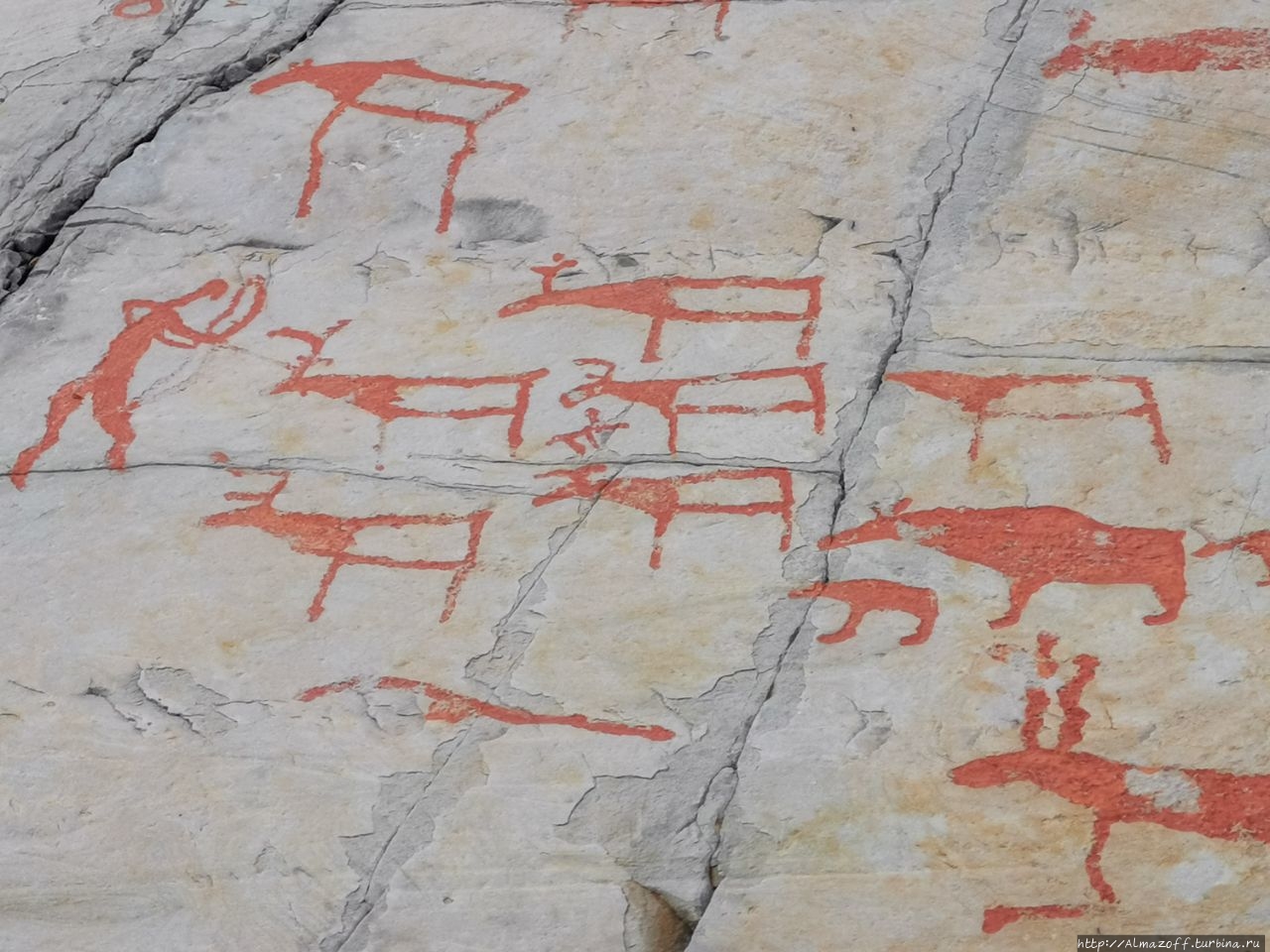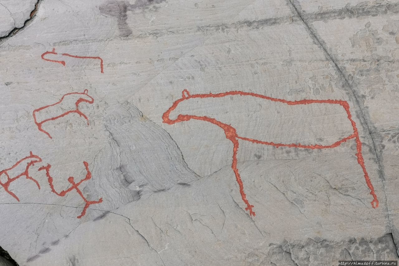 На скальных плитах изображены поездки на охоту, рыбалку и катание на лодках, и, как считается, они представляют микро-пейзажи. Представлен широкий спектр полярной фауны (северный олень, лоси, медведи, рыба, киты, морские птицы и т. д.). Исследования материальной культуры обогащены множеством различных артефактов, показанных на скалах. Хорошие условия хранения позволяют изучать произведения наскального искусства.